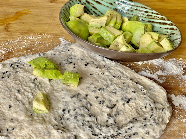 En el bol de la amasadora colocar todos los ingredientes menos las semillas de sésamo y los trocitos de aguacate.